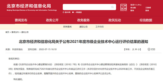公司通过2021年度北京市技术中心评价